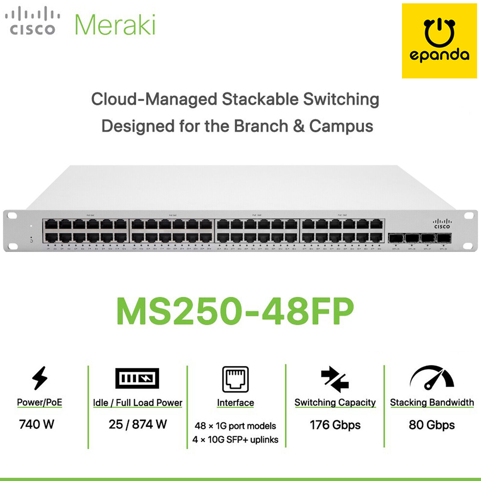 Meraki MS250-48FP L3 PoE+ Access Switch – UNCLAIMEDMeraki Stackable Cloud-Managed Layer 3 Access Switch with 10G SFP+ uplinks, designed for branch and campus!The Cisco Meraki MS250 series switches provide reliable access switching ideal for deploying in branches and small campuses. With stacking capabilities and 10G SFP+ uplinks on every model, redundancy and performance are guaranteed. This family also supports redundant, field-replaceable power supplies for mission critical networks.All Cisco Meraki switches are managed through an elegant, intuitive cloud interface, rather than a cryptic command line. To bring up a Meraki switch, just plug it in; there’s no need for complicated configuration files or even direct physical access to the switch. Meraki’s centralized management gives you granular visibility into your network. The Meraki dashboard also helps you keep track of every configuration change in your network with the detailed event and change logs.Product Hightlights:Gigabit access switching with 48 PoE+ supportFour 10G SFP+ uplink interfacesDual stacking interfaces with up to 80G of bandwidthSupport for field replaceable, redundant power suppliesSwitch capability with up to 176 Gbps6 configurable QoS queues for converged voice, video, and data applicationsUp to 740 watt PoE budget with PoE+ support and dynamic power allocation for powering APs, phones, cameras, and other PoE-enabled devicesLow power consumption and quiet acoustic design.Specifications:Brand / SeriesCisco MerakiManufacturer Part NumberMS250-48FP-HWCompatible Rack Unit1UDimensions1.72 x 19.08 x 20.42” (4.38 x 48.46 x 51.87cm)Weight12.83 lb (5.82 kg)Interfaces48 x 10/100/1000BASE-T Ethernet RJ45 with auto negotiation and crossover detection (auto-MDIX crossover)4 x SFP+ 10GbE uplink2 x stacking portsSwitching capacity176 GbpsStacking Bandwidth80G (dual interface)Available PoE/PoE+ power740WConditionUsed – Pulled from working production environmentA-Grade ConditionOur products are fully operational and functioning as intended. They have been thoroughly cleaned and tested by our highly skilled engineers to ensure they are in A-Grade working condition before handling to customers. Although some units may have some minor cosmetic such as minor scratches they are guaranteed to work like new.12-Month WarrantyYour purchase of this item from ePanda Australia comes with 12 months warranty. We stand by our products and back any of our equipment. Our warranty covers any hardware faults that may arise within this period.GST Tax InvoiceAll your purchases come with GST included Tax Invoice.What’s in the box:1 x Cisco Meraki MS250-48FP-HW (UNCLAIMED)1 x Power Cable – AU Plug2 x 1025W Power Supply – MA-PWR-1025WACWhy buy from us:ePanda-Australia is well-trusted for quality and operates under Australian legitimate ABN.All your purchases are covered under our warranty and a valid GST TAX Invoice.Our products are rigorously tested to ensure their quality before they are handed over to you.Our products are carefully inspected for safety, hygience and cleanliness before handling to youYour item will be fast shipped from our local store in Sydney.Shipping and HandlingYour products will be processed and shipped as soon as payment is confirmed.Shipping discounts may be available for some purchases of multiple items or combined shipment, please be sure to contact us before you pay.You should expect your order to be shipped as scheduled if you don’t receive any email from us.Once your order has been dispatched, you will be updated with confirmation of tracking information where you will be able to track your package directly on the courier’s website.We guarantee all our products are 100% genuine and brand new unless specifically stated otherwise.Return PolicyIf you are not happy with your purchased product or change your mind, you may return it for refund provided that:The product is unopended and returned in the original condition as it was received.You contacted us within 7 calendar days of the product being delivered to you.All products will be subject to a restocking fee of 20% of the original purchase price.For any DoA claim, you must contact us within 7 calendar days of delivery and provide proof of your purchase. Contact UsIf you have any question(s) or problems about your order, please feel free to contact us. We will try our best to attend your enquiries within 24 hours during the business day. About FeedbackIf you’re experiencing problems, please contact us to resolve the problem before leaving feedback. We love to serve our customers and ensure for full satisfaction. Please always leave POSITIVE feedback and a 5-STAR rating to us.