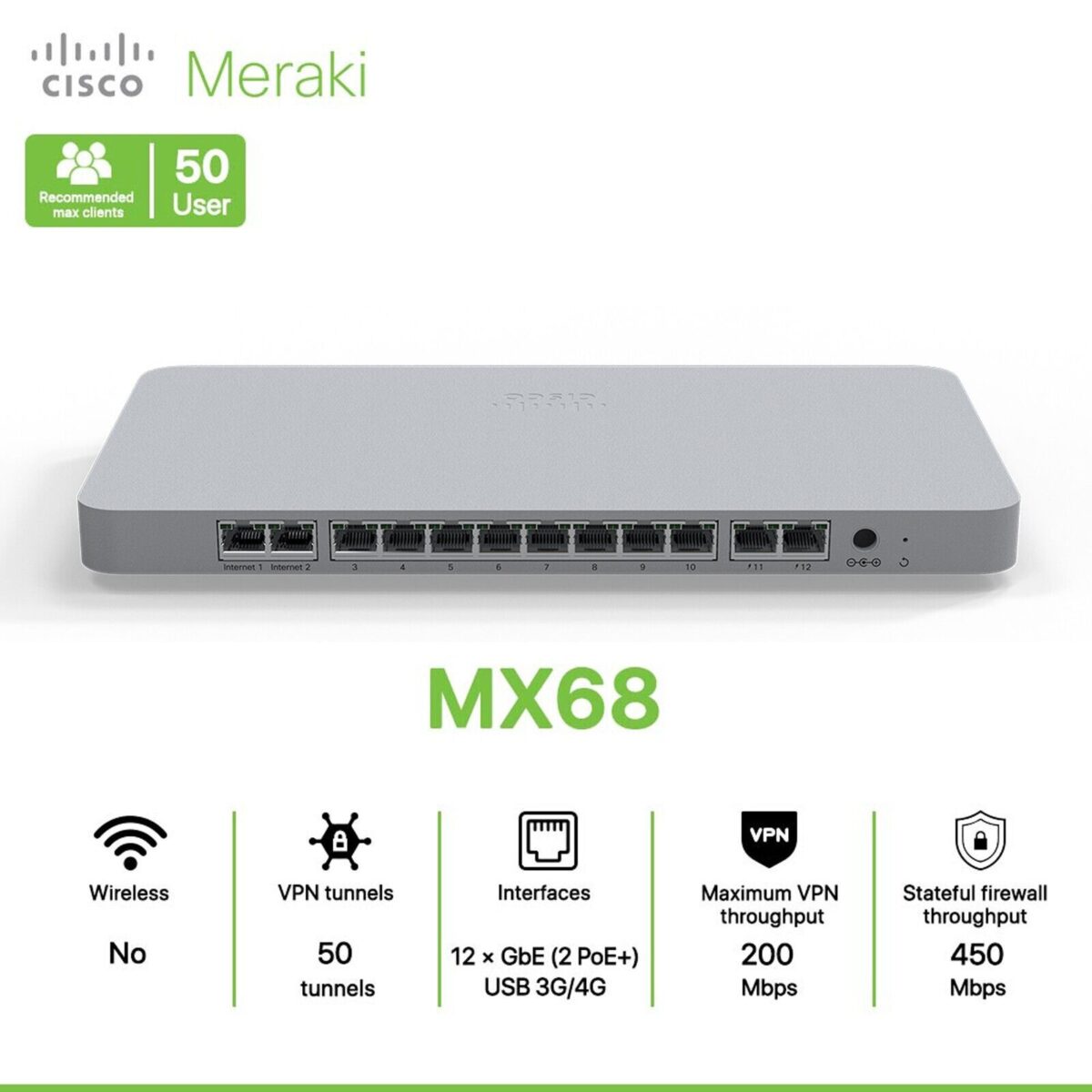 Meraki MX68 Cloud-Managed Security – UNCLAIMEDAn industry leading cloud-managed networking and security appliance for branch, all-in-one UTM and SD-WAN!The Cisco Meraki MX68 Security Appliance MX68W-HW is cloud-managed security & SD-WAN appliance, ideal for organizations considering a Unified Threat Management (UTM) solution for distributed sites, campuses or datacenter VPN concentration.Meraki Cloud Management: A Powerful CombinationThe MX68 is managed through the Meraki cloud, with an intuitive browser-based interface that enables rapid deployment without training or certifications. The MX68’s firmware is always kept up to date from the cloud. New features, bug fixes, and enhancements are delivered seamlessly over the web, meaning no manual software updates to download or missing security patches to worry about.Product HighlightsWAN: 2 GbE, one USB (cellular failover)LAN: 10 GbE (two PoE+)600 Mbps firewall throughput300 Mbps site-to-site VPN throughputSupports up to 50 usersFeature Highlights:SD-Branch Cloud PlatformUnified management for security, SD-WAN, Wi-Fi, switching, MDM, and IoTCentralized management via web-based dashboard or APITrue zero-touch provisioningSmartphone-like firmware updatesUnified Threat ManagementNext-generation layer 7 firewall and content filteringAdvanced Malware Protection (AMP) with Cisco Threat GridIntrusion detection and prevention (IDS/IPS)Visibility of security events through an elegant security center GUICloud SecurityBuilt-in SD-WAN connectivity to Cisco Umbrella global data centersApplication prioritizationSSL decryption/inspection, data loss prevention (DLP), CASBRemote browser isolation, granular app control, SaaS tenant restrictionsConnectivityLayer 7 application optimization over self-healing Auto VPN (SD-WAN fabric)Extension of SD-WAN fabric to hybrid clouds and Cisco UmbrellaSupport for native IPsec or Cisco AnyConnect remote client VPNInstant wired failover with added 3G/4G failover via USB modemAdvanced analytics with MLAutomatically applied Smart Thresholds to identify true app degradationAt-a-glance performance of apps across the LAN, WAN, and app serverInstant root-cause analysis of degradation with intelligent recommendationsStatus of multi-site uplinks in one view, including cellularSpecifications:Brand / SeriesCisco MerakiManufacturer Part NumberMX68-HWDimensions1.1 x 5.8 x 11.2 in / 27 x 148 x 284 mmWeight2.46 lb (1.11 kg)LAN Interface10x Dedicated GbE RJ452x Dedicated GbE RJ45 PoE+WAN Interface2 x GbE RJ45 1 x USB (cellular failover)Cellular interface1 x Cellular uplink via 3rd party USB ModemRecommended user case50 usersStateful Firewall Throughput600 MbpsSecurity Throughput300 MbpsMax VPN Throughput300 MbpsMax Concurrent VPN Tunnels (Site-to-Site VPN)50Power Supply100W DCPower Load (idle/max)11W / 79WConditionBrand NewWhat’s in the box:1 x Cisco Meraki MX68-HW (Unclaimed)1 x Cisco Meraki Power Adapter MA-PWR-100WAC1 x Set of Mounting Accesories1 x Cisco Meraki MX68-HW Information GuideCome in original Cisco Meraki MX68 packaging.Why buy from us:ePanda-Australia is well-trusted for quality and operates under Australian legitimate ABN.Your purchases come with 1-year warranty and a valid GST TAX Invoice.Our products are rigorously tested to ensure their quality before they are handed over to you.Our products are carefully inspected for safety, hygience and clealiness before handling to you.Your item will be fast shipped from our local store in Melbourne.Shipping and HandlingYour products will be processed and shipped as soon as payment is confirmed.Shipping discounts may be available for some purchases of multiple items or combined shipment, please be sure to contact us before you pay.You should expect your order to be shipped as scheduled if you don’t receive any email from us.Once your order has been dispatched, you will be updated with confirmation of tracking information where you will be able to track your package directly on the courier’s website.We guarantee all our products are 100% genuine and brand new unless specifically stated otherwise.Return PolicyIf you are not happy with your purchased product or change your mind, you may return it for refund provided that:The product is unopended and returned in the original condition as it was received.You contacted us within 7 calendar days of the product being delivered to you.All products will be subject to a restocking fee of 20% of the original purchase price.For any DoA claim, you must contact us within 7 calendar days of delivery and provide proof of your purchase. Contact UsIf you have any question(s) or problems about your order, please feel free to contact us. We will try our best to attend your enquiries within 24 hours during the business day. About FeedbackIf you’re experiencing problems, please contact us to resolve the problem before leaving feedback. We love to serve our customers and ensure for full satisfaction. Please always leave POSITIVE feedback and a 5-STAR rating to us.